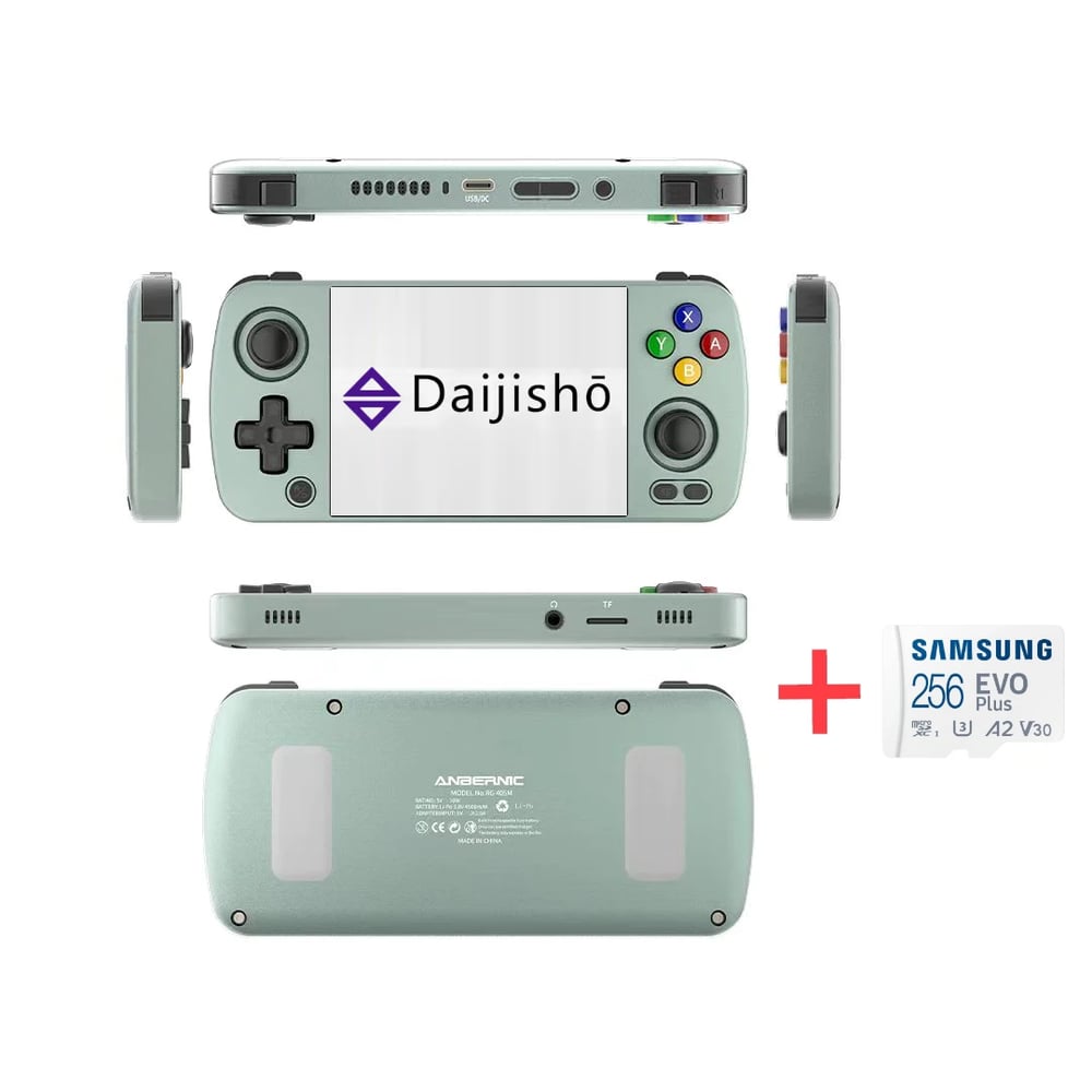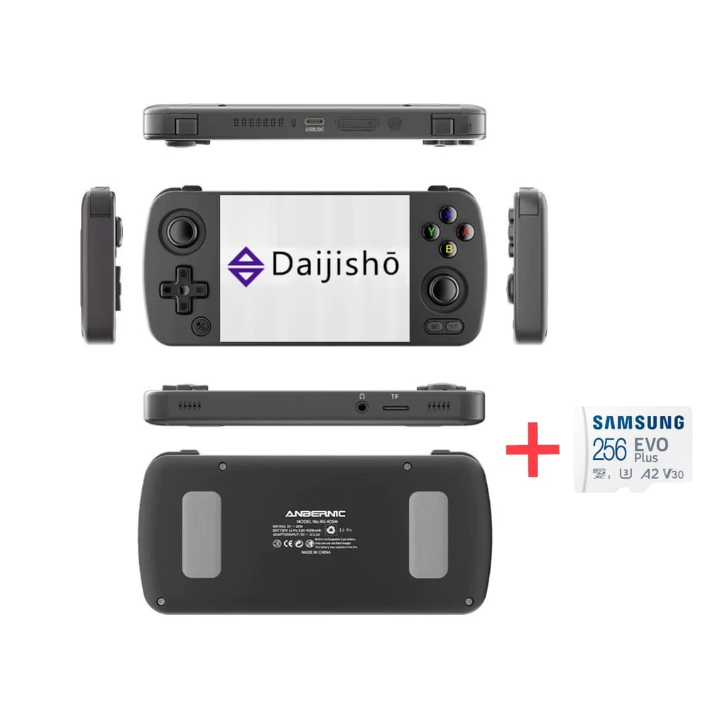 This is the latest sleek metallic finish RG405M handheld console that I have loaded with GammaOS and paired with my own custom Samsung 256 GB card loaded so that you can quickly set up Daijisho launcher and enjoy playing all the console and arcade classics up to the mid 2000s.